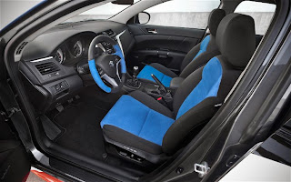 Suzuki wants this performance sedan to highlight the brand's motorcycle heritage, and thus endowed the Apex concept with HID headlights from the Euro-market Kizashi, LED foglights, and graphics inspired by the GSX-R race motorcycle. Inside are black leather seats with blue Alcantara inserts. To transmit the additional power to the pavement, Suzuki fitted the Apex with "burnt asphalt" alloy wheels wearing sticky Yokohama S.Drive tires.